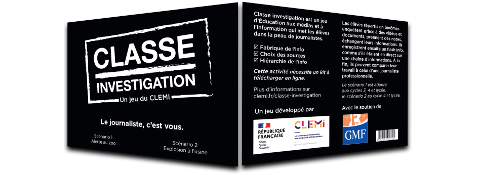 Classe investigation est un jeu d’Éducation aux médias et à l’information. Il a été développé par le groupe de travail MediaLab, composé d’enseignants et de journalistes, et le pôle Studio du CLEMI. Les élèves sont plongés dans une enquête journalistique immersive. Par groupe de deux, ils doivent retranscrire les informations qu’ils découvrent via texte, audio et vidéo, pour à la fin produire un contenu journalistique (format print ou numérique). À l’issue du jeu, ils peuvent comparer leur travail avec celui de journalistes professionnels. Les différents scénarios permettent de travailler sur la façon dont l’information se fabrique : hiérarchie de l’information, choix des sources, responsabilité du journaliste, contraintes du métier… À chaque fois, une phase de débriefing suit le jeu.